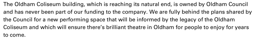 Earlier in the day, Oldham Council (presumably with ACE’s blessing) rushed out a press release heralding plans for a shiny new £24m theatre.